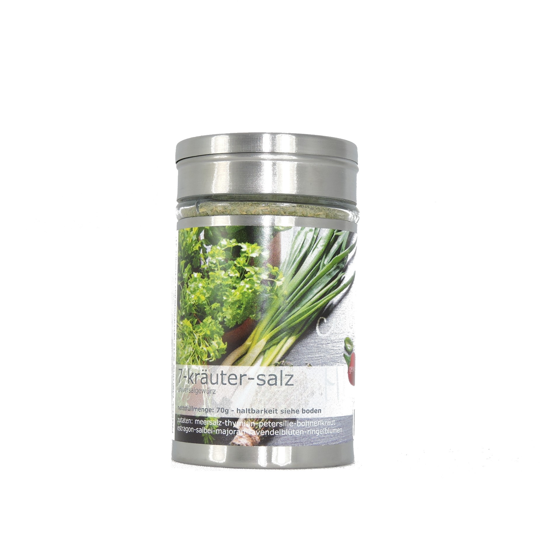 Füllgewicht: wird in einem Edelstahl/Glas Gewürzstreuer mit 70g Nettofüllmenge geliefert.